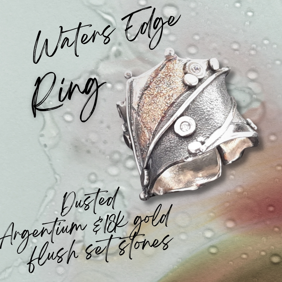 Waters Edge Ring is the stand alone sister of Waters Edge Bracelet. There is some redundancy between the two, but the challenge of scale and addition of fusing 18k gold dust, as well as flush setting stones, makes it a welcome addition.